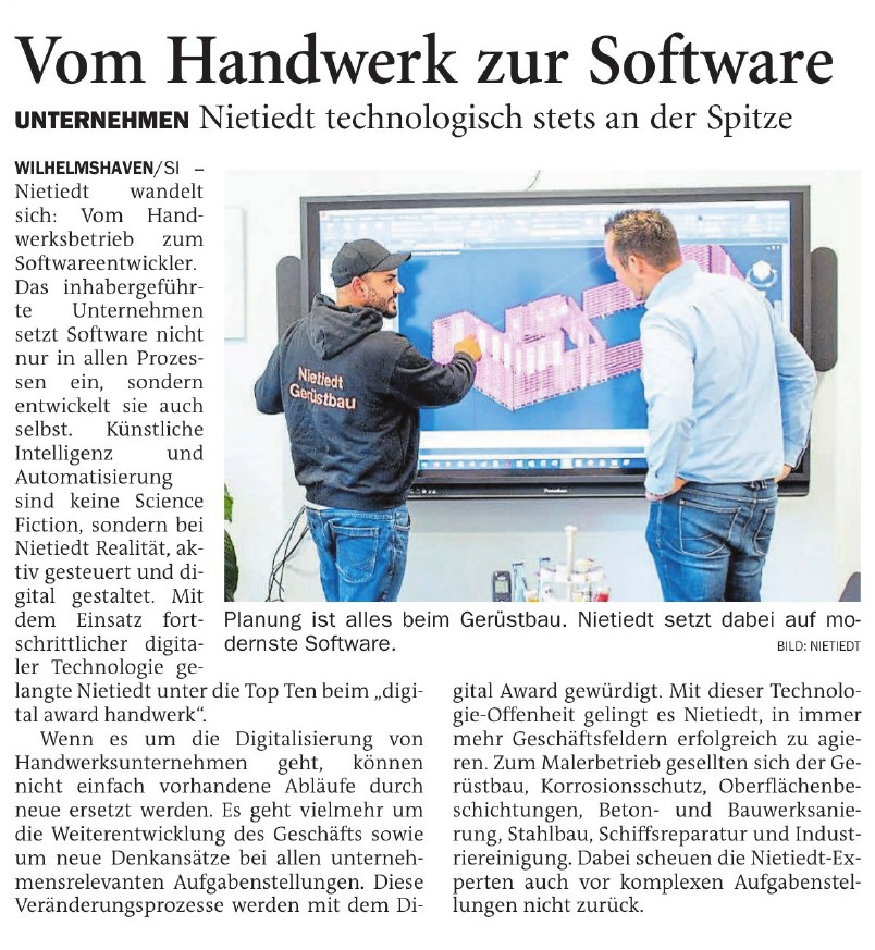 Die Nietiedt-Gruppe wurde für den ersten Wilhelmshavener Innovationspreis nominiert, und zwar aufgrund unserer wegweisenden Digitalisierungsstrategie. Als ein mittelständisches Familienunternehmen ist es unser vorrangiges Ziel, unsere Zukunftsbeständigkeit zu gewährleisten. Aus diesem Grund setzen wir kontinuierlich auf die Weiterentwicklung und Optimierung unserer Prozesse. Auf diese Weise möchten wir sicherstellen, dass wir unseren Kunden auch zukünftig als ein attraktiver Partner zur Verfügung stehen können.