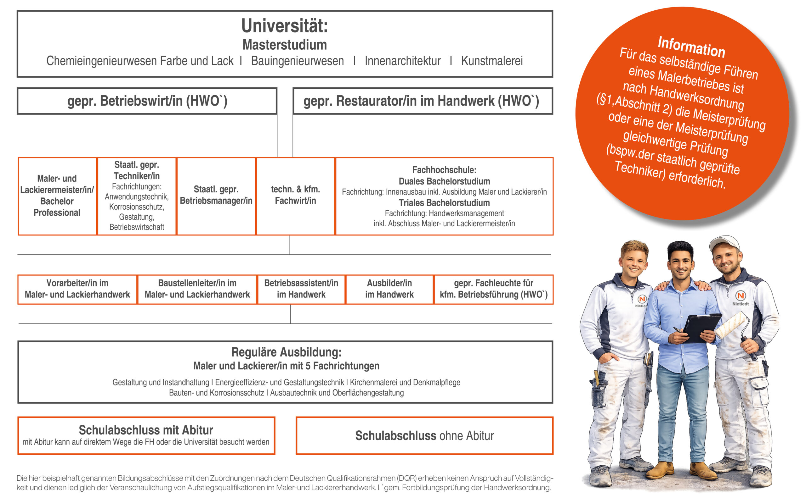 Dann schließe Dich uns an, werde ein Teil des Nietiedt-Teams! Wir bieten Dir alle Möglichkeiten, um mit uns zu „wachsen“. Wie Du dem Schaubild entnehmen kannst, bilden wir Maler und Lackierer aus (m/w/d). Wir unterstützen Dich jederzeit und auf allen Ebenen, damit Du Deine Ausbildung erfolgreich abschließt. Selbstverständlich bekommst Du nach erfolgreicher Handwerksausbildung einen Gesellenbrief; also ein Abschlusszeugnis als Facharbeiter. Wenn Dich der Ehrgeiz packt, dann stehen Dir nach der erfolgreich bestandenen Gesellenprüfung alle Türen offen. So ist eine Fortbildung zum Meister an einer Fachschule möglich. Auch hier begleiten Dich die Nietiedt-Profis, damit Du die Weiterbildung erfolgreich bestehst.