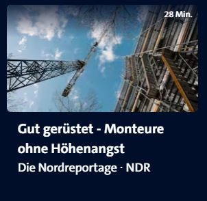 Die Nordreportage begleitet die Monteure ohne Höhenangst bei ihren Einsätzen. Der kurzweilige Einblick in den Beruf des Gerüstbauers kann über nachfolgenden Link in der ARD Mediathek abgerufen werden.