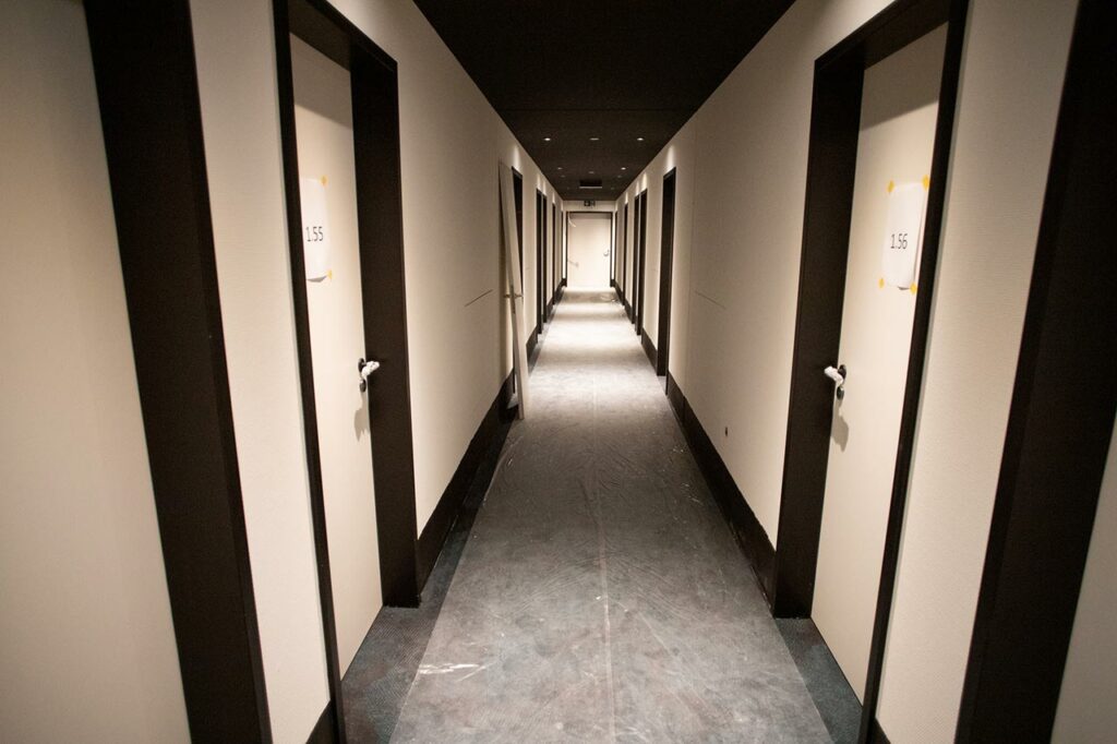 Das neue Motel One in Bonn begrüßt seine Gäste direkt am Hauptbahnhof. Das moderne Designhotel verfügt insgesamt über 235 Zimmer. Mehr als 4300 m² Teppichboden und 400 m² Parkett sind in dem Neubau verlegt worden. Die Bodenleger der Nietiedt-Gruppe am Standort Duisburg haben diese Aufgabe erfolgreich übernommen. Bevor die textilen und elastischen Böden verlegt worden sind, sind im Rahmen der Bodenbelagsarbeiten die Untergründe grundiert und gespachtelt worden. Nachdem die Böden in alle Räumen und Fluren verlegt worden waren, haben die Nietiedt-Profis Übergangsschienen, Fuß- und Sockelleisten angebracht. Je nach Einsatzort sind zudem Hygieneleisten angebracht worden.
