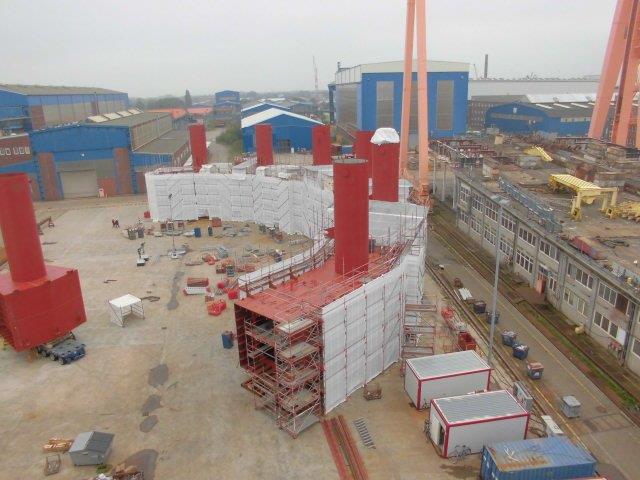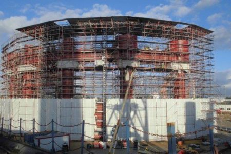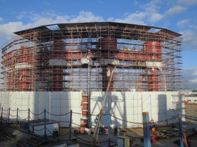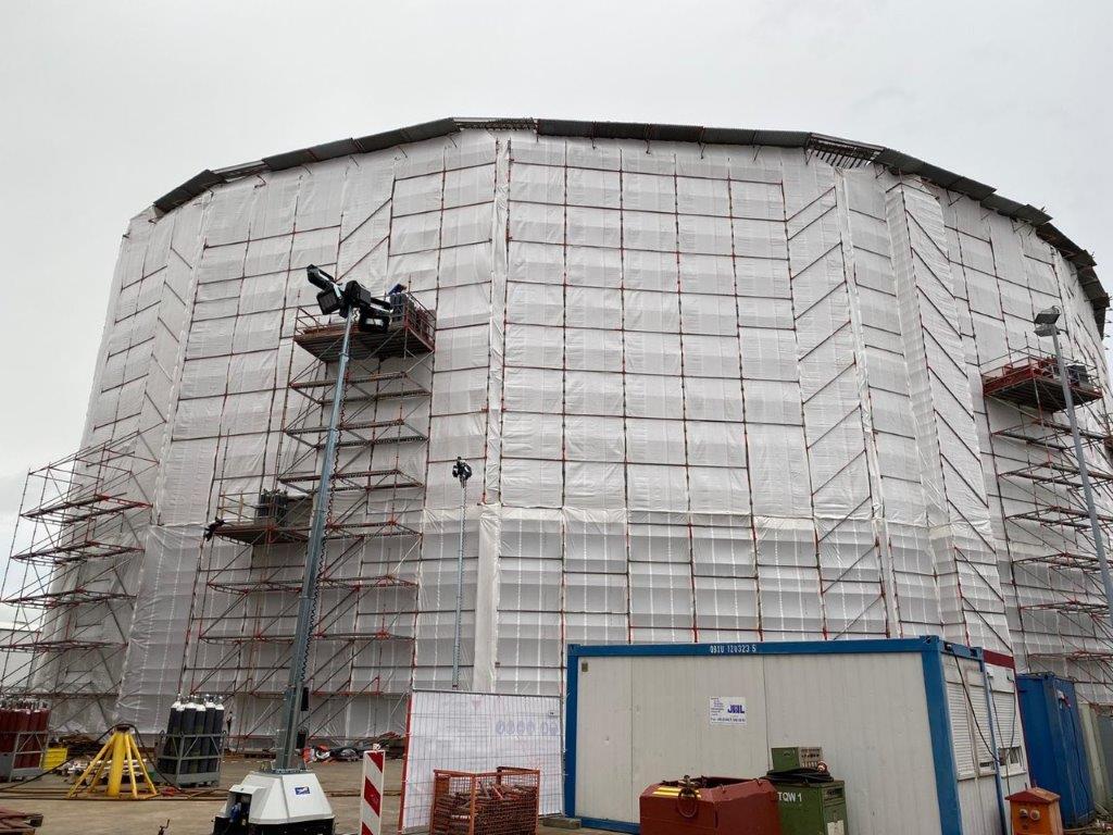 Für Arno Abken – Leiter der Nietiedt-Niederlassung in Riepe, war dieser Auftrag logistisch, materiell sowie personell durch den geforderten Schichtbetrieb des Auftraggebers eine herausfordernde Aufgabenstellung. Die Käfige werden in einer Art Baukastenprinzip gefertigt. Hierbei werden vorgefertigte Bauteile, die sogenannte Blöcke, in einer Halle erstellt, die dann aufgrund der enormen Ausmaße unter freiem Himmel zusammengefügt werden. Unter Berücksichtigung der stark unterschiedlichen Größe dieser Bauteile mussten die Gerüstbauer die Einhausung dem Baufortschritt des Gesamtbauwerkes anpassen.