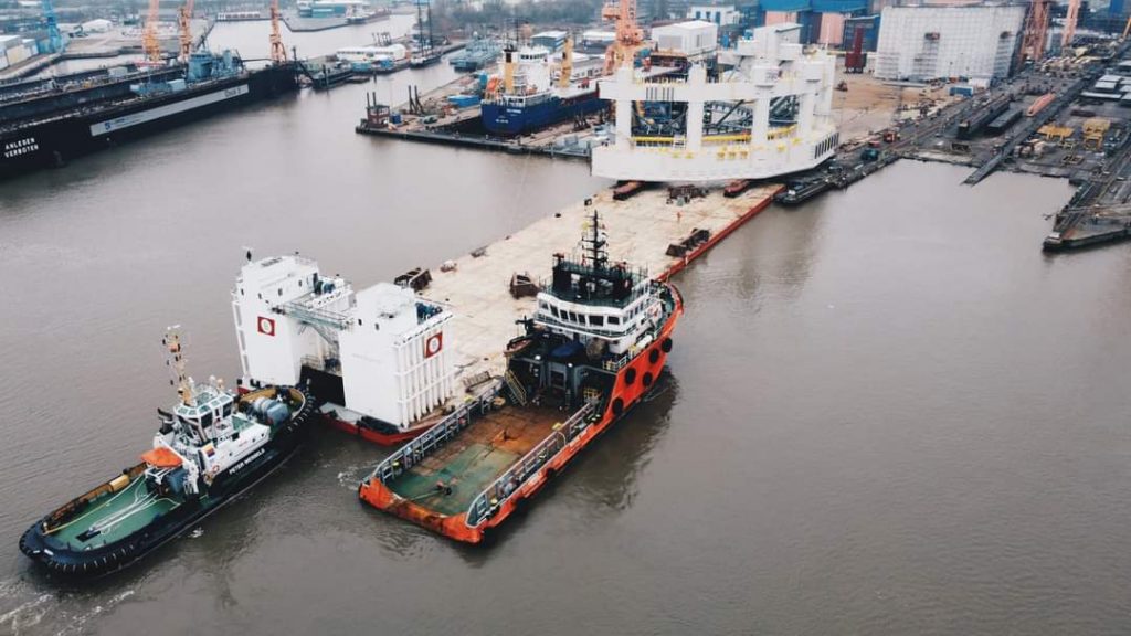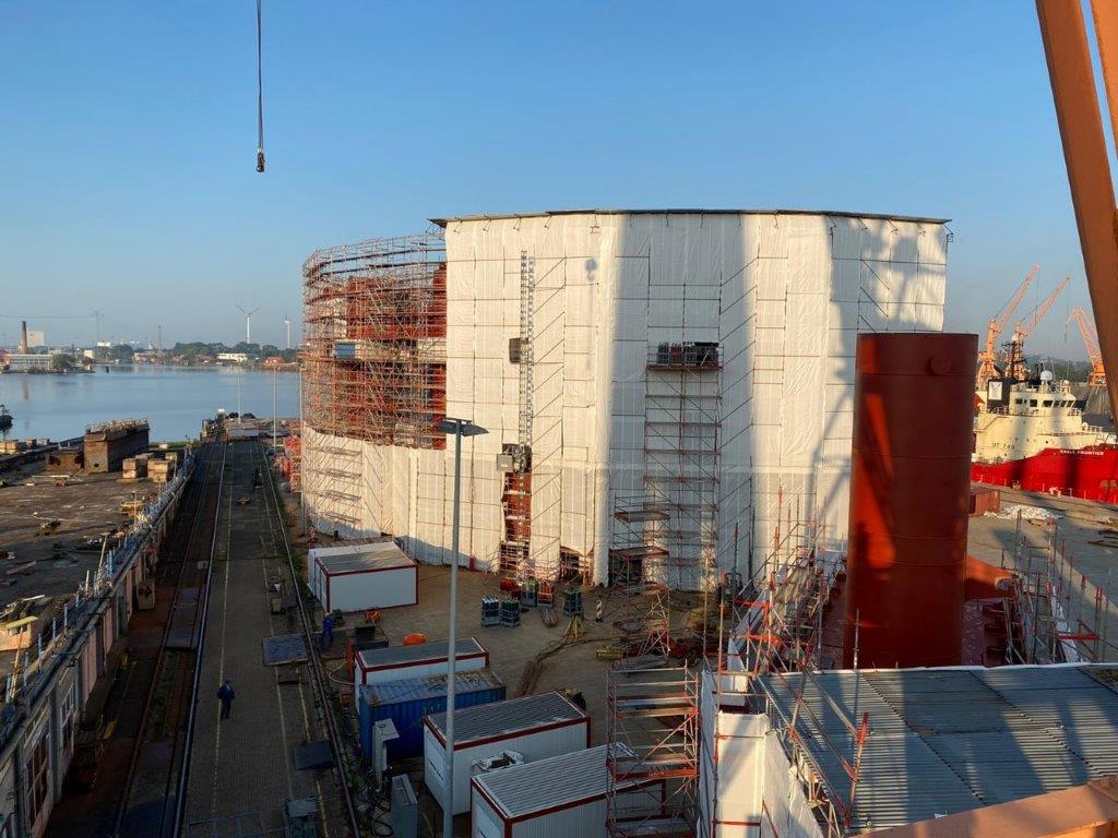 Für den ostfriesischen Nietiedt-Routinier Arno Abken gab es noch mehr knifflige Herausforderungen zu lösen. Die Form des Bauteiles ist ein Halbring mit einer entsprechenden Rundung, der auch noch komplett verplant werden und mit einem Dach versehen werden musste. Ein Kassettendach auf einem halbrunden Bauteil, das ist schon eine wirkliche Aufgabe für das Team aus Ostfriesland gewesen. Die Nietiedt-Truppe hat diese Aufgabe angenommen und souverän gelöst. Es wurden aus Planen-Material „Tortenstücke“ auf Maß gefertigt und dann verbaut. Insgesamt wurden mit dieser bewährten Methode vier Halbringe hergestellt. Pro Ring wurden ca. 60.000 m³ Gerüst verbaut. Die fertigen Ringhälften, mit einem Gesamtdurchmesser von 80 Metern und einer Höhe von ca. 24 Metern, wurden dann nach Norwegen verschifft. Dort wurden sie dann miteinander vereint und diese außergewöhnliche „Hochzeit“ konnte dank der klasse Leistung des Nietiedt-Teams termingerecht gefeiert werden.