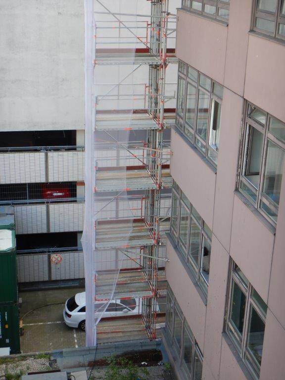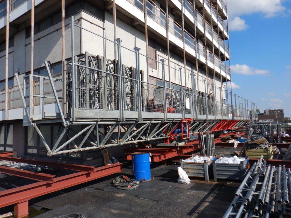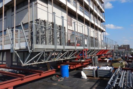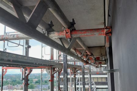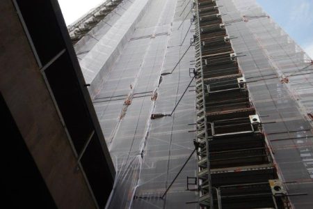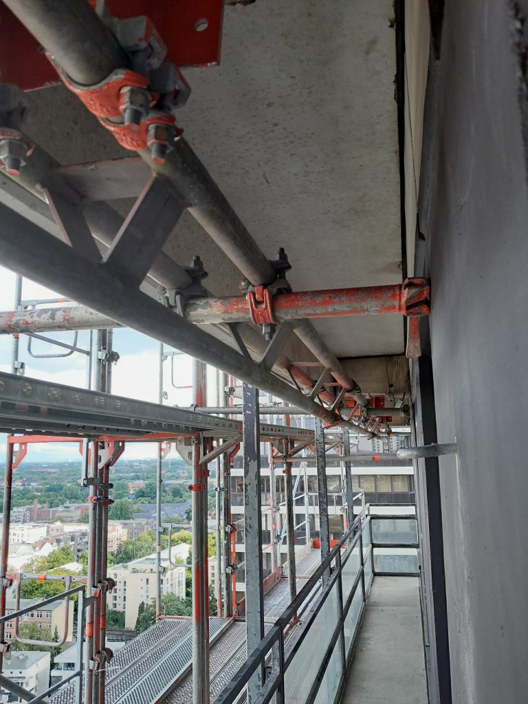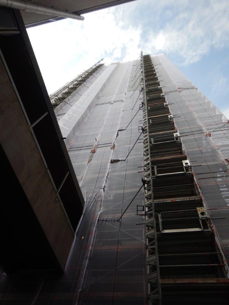 Mit einer eindrucksvollen Gerüstkonstruktion von 30,00×86,00 Metern und einer Besonderheit aufgrund seiner außergewöhnlichen Höhe, wurden drei Rahmen pro Stielreihe miteinander verbunden. Diese Konstruktion ermöglichte eine sichere Arbeitsumgebung, die den enormen Anforderungen in dieser Höhe gerecht wird. Die horizontale Verankerung am Gebäude erstreckte sich über die oberen 18 Etagen und umfasste etwa 540,00 lfdm, die mittels Berliner-Bindern sicher fixiert wurden. Zusätzlich wurde das gesamte Gerüst sorgfältig abgenetzt, um höchste Sicherheitsstandards zu gewährleisten.