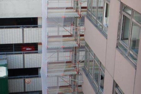 Zur Unterstützung des Bauprozesses wurden zwei GEDA 500 Aufzüge am Gerüst installiert, während für die anderen drei Fassadenseiten Mastkletterbühnen der Firma ALIMAK eingesetzt wurden. Diese fortschrittlichen Arbeitsmittel gewährleisteten Effizienz und Sicherheit bei der Bearbeitung der Fassade. Das Projekt beinhaltete eine umfassende Grundinstandsetzung der gesamten Fassade, einschließlich dem Entfernen des alten Anstrichs sowie der nachfolgenden Betonsanierung. Diese anspruchsvolle Aufgabe erforderte Präzision und Fachkompetenz, die unser Nietiedt-Team mit Bravour umsetzte!