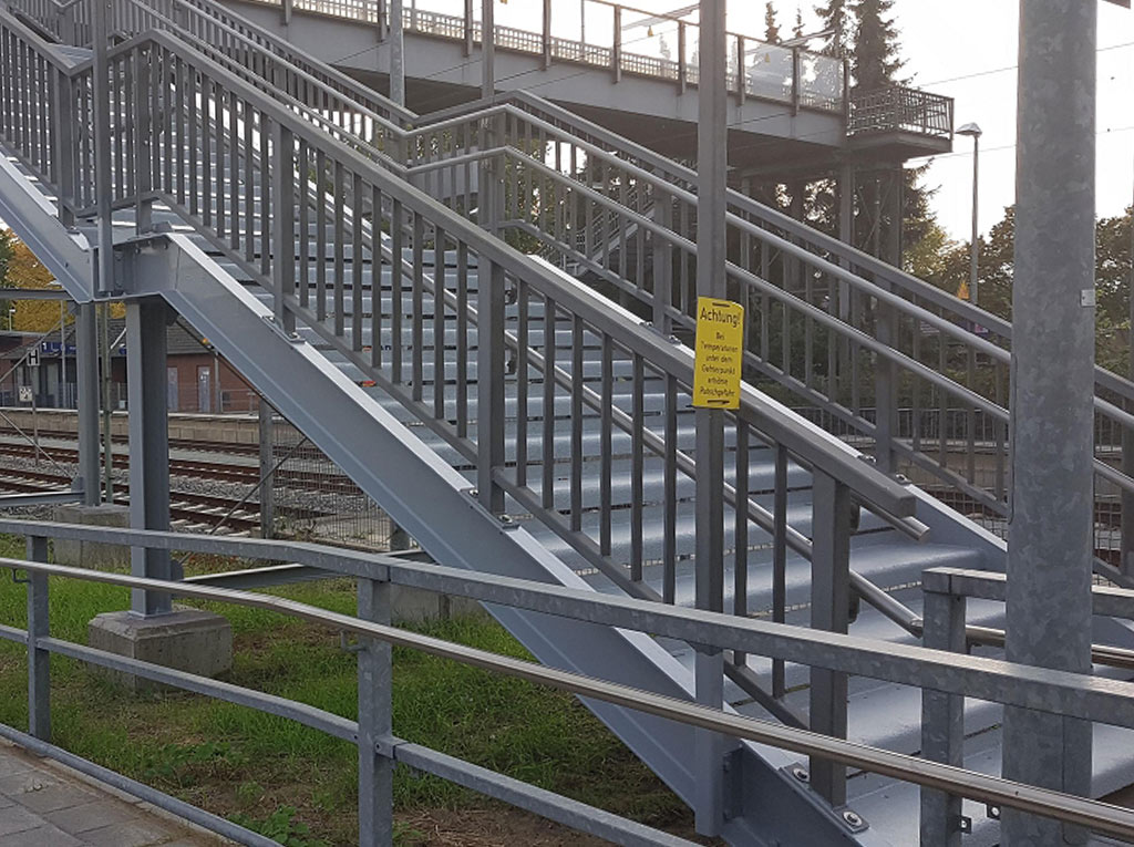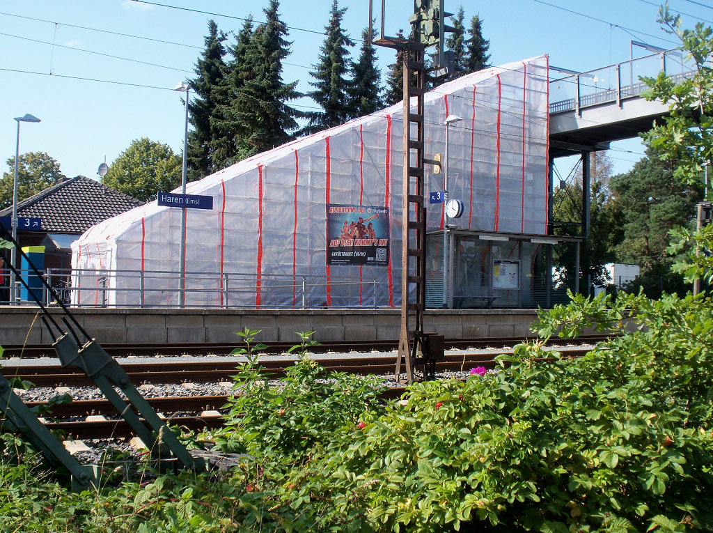Die Deutsche Bahn modernisiert permanent ihre bestehende Infrastruktur. In dem Zuge haben die Mitarbeiter der Nietiedt-Niederlassung Lingen die Fußgängerbrücke am Bahnhof Haren (Ems) erneuert. Zunächst hat die Nietiedt Gerüstbau GmbH die Auf- und Abgänge der Brücke eingerüstet und eingezeltet. Im Anschluss konnten die Oberflächentechniker, die ebenfalls am Standort Lingen vertreten sind, die Vorbereitungen für einen atmosphärischen Korrosionsschutz an der Stahlträgerkonstruktion durchführen. Hierfür sind die Oberflächen zunächst mit Hochdruck gereinigt worden. Es folgte die Strahlentrostung als Vorbereitung für die dreifache Beschichtung nach Blatt 87, eine Norm der Deutschen Bahn.