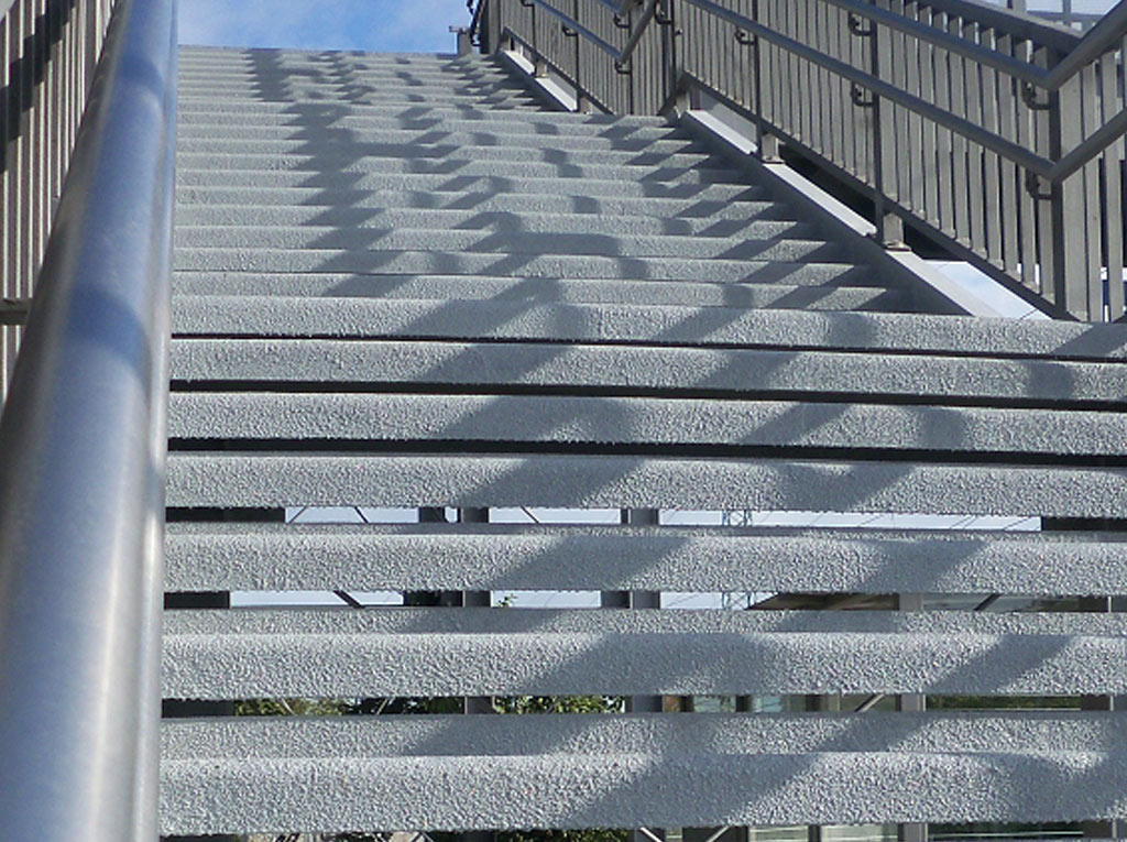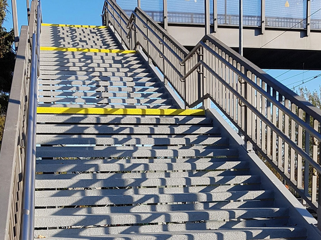 Die bestehenden Beläge auf den Treppenstufen wurden parallel zu den werterhaltenden Korrosionsschutzmaßnahmen durch neue rutschhemmende Dünnschichtbeläge ersetzt. Hierfür sind die alten Bodenbeläge durch Strippen entfernt worden. Nach der Systemgrundierung erfolgt dann der Auftrag der RHD-Beläge auf allen waagerechten und senkrechten Flächen. Zum Abschluss haben die Nietiedt-Profis die erforderlichen Signalmarkierungen auf den Anfangsstufen aufgetragen.