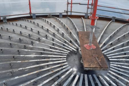 Daraufhin wurde mit dem Neubau des oberen Segmentes auf der bereits gesetzten Bauleere begonnen. Das alte Dach inklusive der oberen zwei Meter der Mantelflächen wurde dabei komplett demontiert. Danach wurde mit dem Aufsetzen des neuen Segmentes und dem umlaufenden Verschweißen begonnen. Somit wurde nun die Dichtigkeit des Tanks wieder hergestellt.