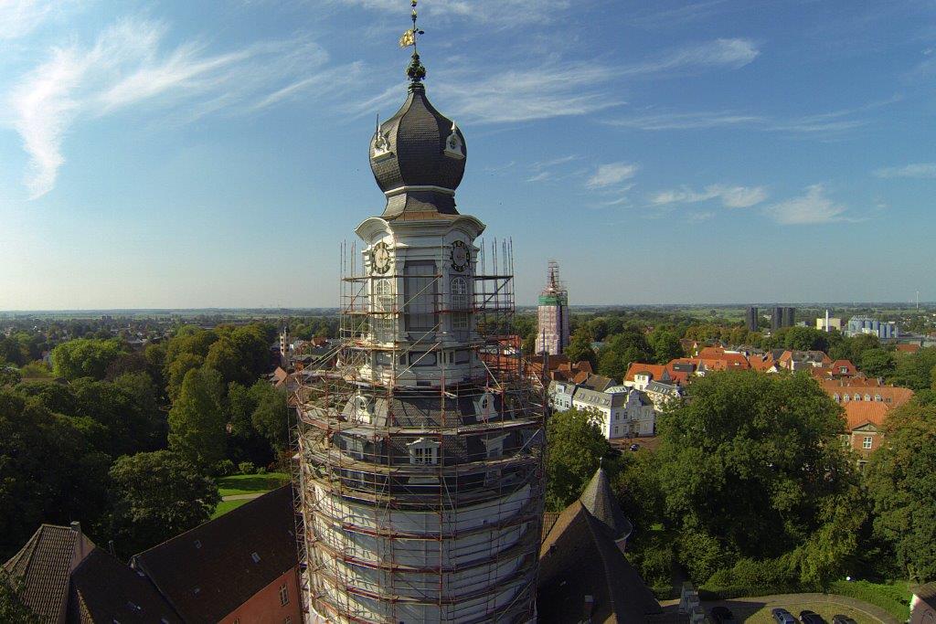 Das Wahrzeichen der Stadt Jever wurde während seiner Renovierung von einem Nietiedt-Gerüst fachgerecht „versteckt“. Die Auflagen des Denkmalschutzes und die Einschränkungen, die der Besucherstrom des Schlossmuseums nach sich zieht, wurden hier beim Bau selbstverständlich berücksichtigt.