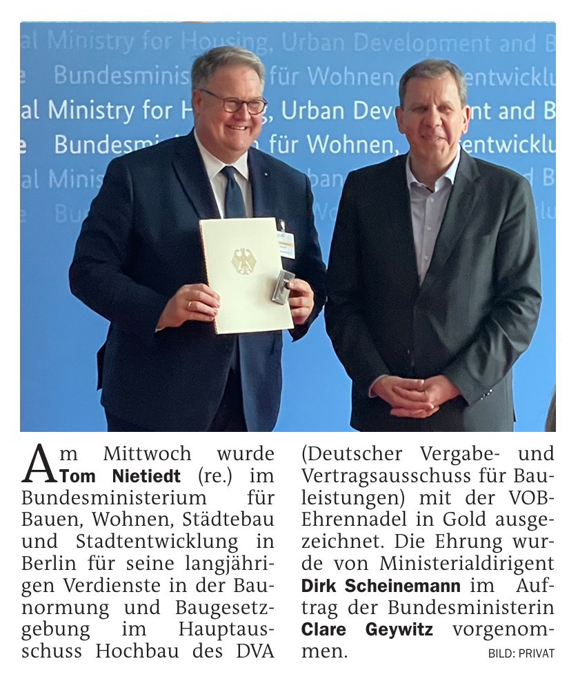 Heute wurde im Bundesministerium für Bauen, Wohnen, Städtebau und Stadtentwicklung (BMBWS) in Berlin Herrn Tom Nietiedt für seine langjährigen großen Verdienste in der Baunormung und -Gesetzgebung in den Ausschüssen Hauptausschuss Hochbau im DVA und im Vorstand des Deutschen Vergabe- und Vertragsausschuss die VOB-Ehrennadel in Gold nebst Ehrenurkunde überreicht.