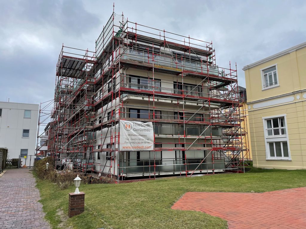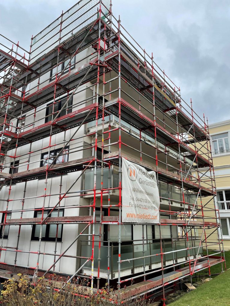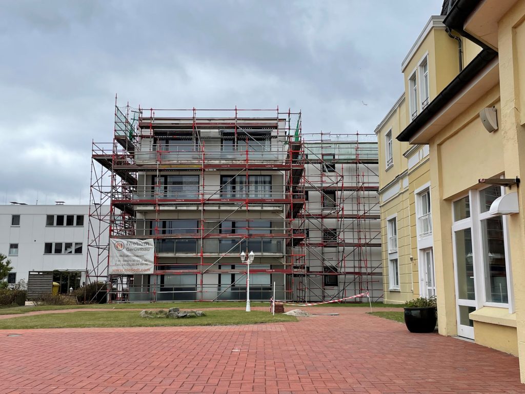 Das Haus „Meeresluft“ befindet sich in der Peterstraße 22 auf Wangerooge und beherbergt Touristen. Die Ferienapartments überzeugen mit einer liebevollen Einrichtung und zeichnen sich durch ihre hervorragende Lage aus – ruhig, strandnah und zentral. Direkt in der Nähe befindet sich der charmante Ortskern und der beliebte Badestrand. Zahlreiche Strandkörbe und breite Liegeflächen laden ein, die herrliche Aussicht zu genießen. Um eine Dach- und Fassadensanierung am Haus „Meeresluft“ ausführen zu können, wurde die Nietiedt Gerüstbau GmbH vom Standort Wilhelmshaven mit den Gerüstbauarbeiten beauftragt.