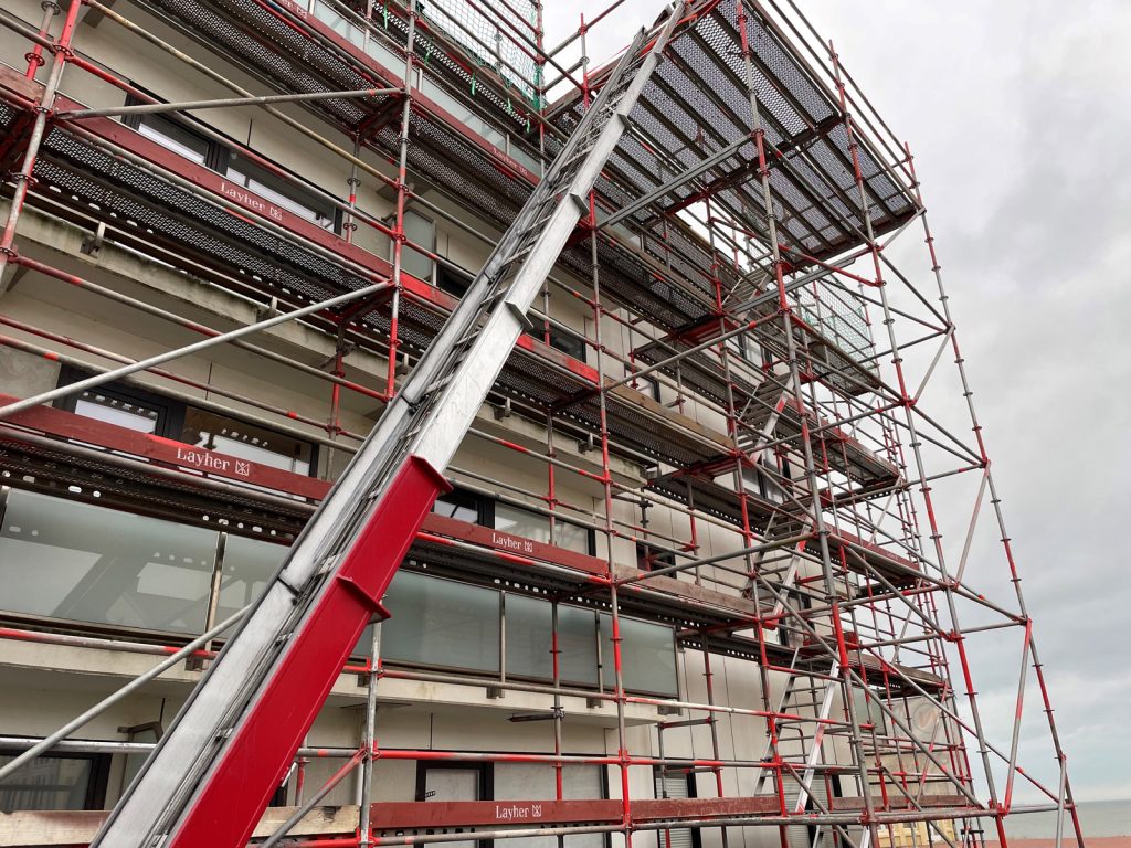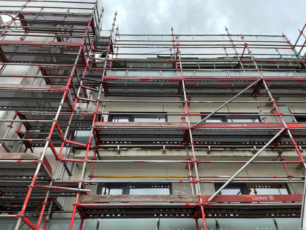 Das Gerüst musste aufgrund der örtlichen Gegebenheiten (unterschiedliche Höhen im Bereich der Aufstellflächen) sowie teilweise auf schräge Flächen gegründet werden. Deshalb hat sich die Bauleitung dazu entschieden, die Fassade mit dem (Layher) Modulgerüst einzurüsten, um bei der Gerüstgründung effektiver zu sein. Zudem konnte das Gerüst nicht überall am Bauwerk geankert werden, was eine Abstützung des Gerüstes mittels Stützgerüst zur Folge hatte. Darüber hinaus stellte sich die Anlieferung und Lagerung des Gerüstmaterials aufgrund von zu geringen Platzverhältnissen als Herausforderung dar. Eine Genehmigung, um das Gerüstmaterial zum Teil auf der Straße zu lagern, wurde auf Anfrage nicht erteilt. Die Gerüstteile wurden daher nach und nach angeliefert, was eine schrittweise Einrüstung der Baustelle zur Folge hatte. Eine effiziente Planung garantierte die termingerechte Ausführung des Gerüstbauauftrags.
