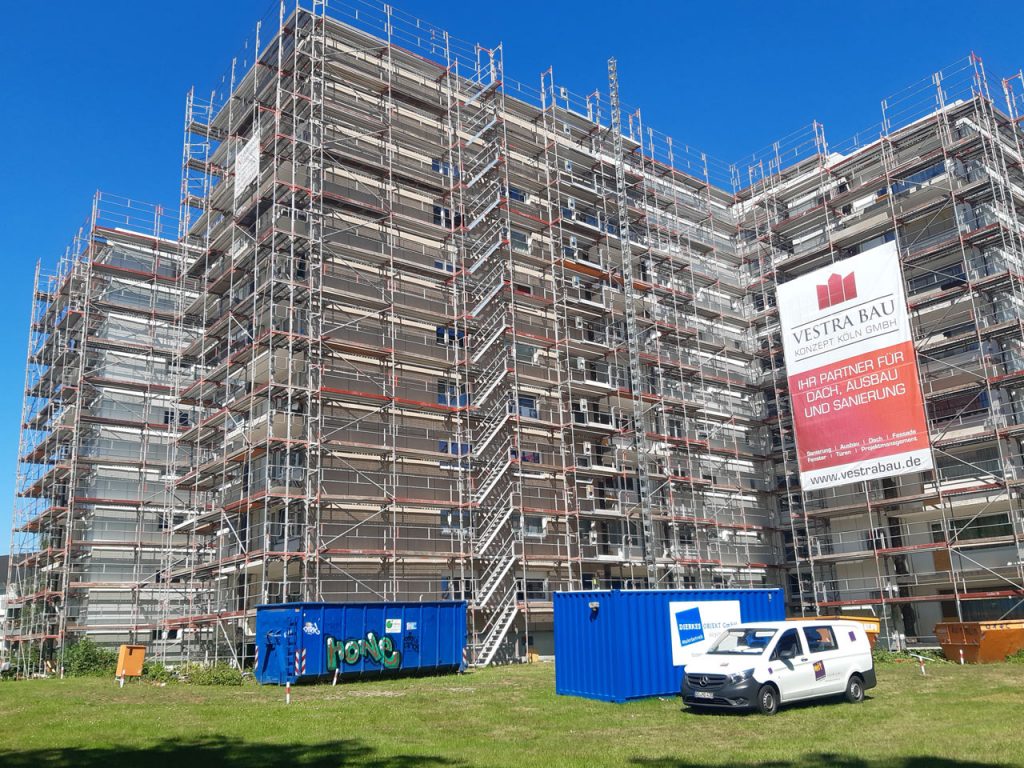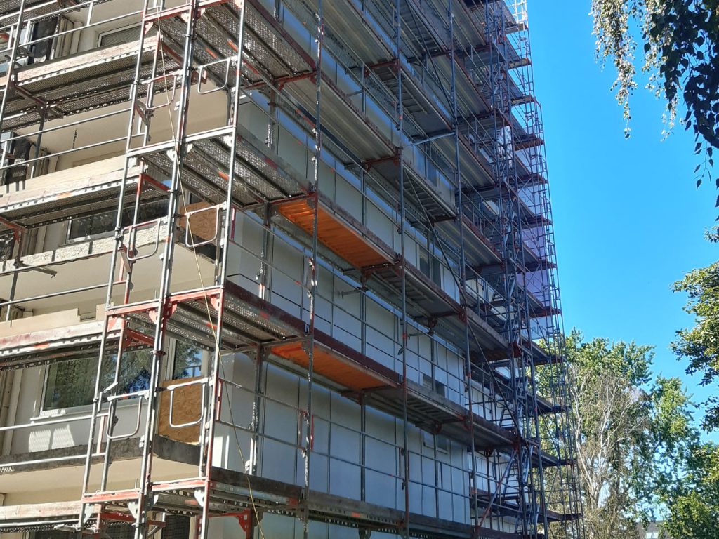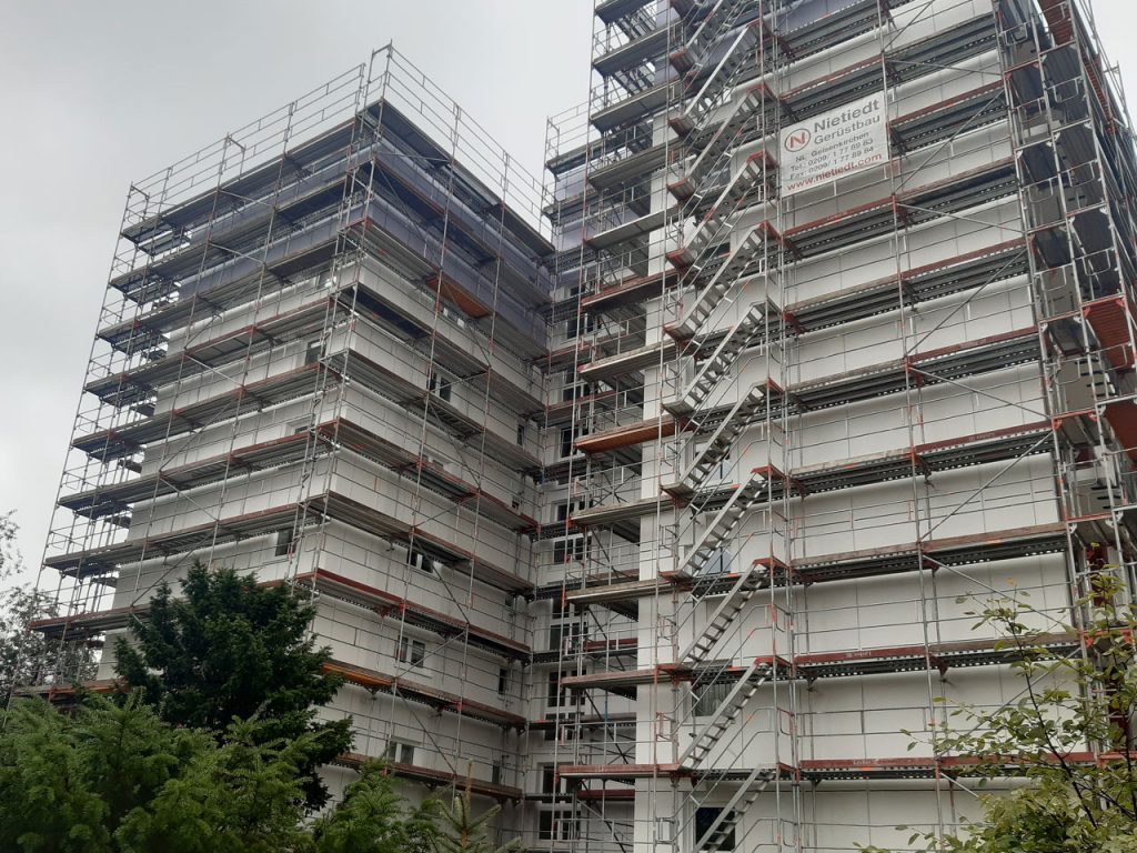 Die Gerüstbauer der Nietiedt Gerüstbau GmbH in Gelsenkirchen sind für die Fassaden- und Dachsanierung eines Wohnblocks mit der Planung und der Errichtung eines Fassadengerüstes beauftragt worden. Die Gesamtfläche des Gerüstes betrug 7000 m². Auf Grund der Gebäudehöhe sind neben zwei Materialaufzügen zusätzlich Seilaufzüge errichtet worden, um für die ausführenden Gewerke den Materialtransport kraftschonend und effizient zu gestalten. Die errichteten Treppentürme ermöglichen einen sicheren und ergomischen Zugang zu den Arbeitsplätzen auf dem Gerüst.