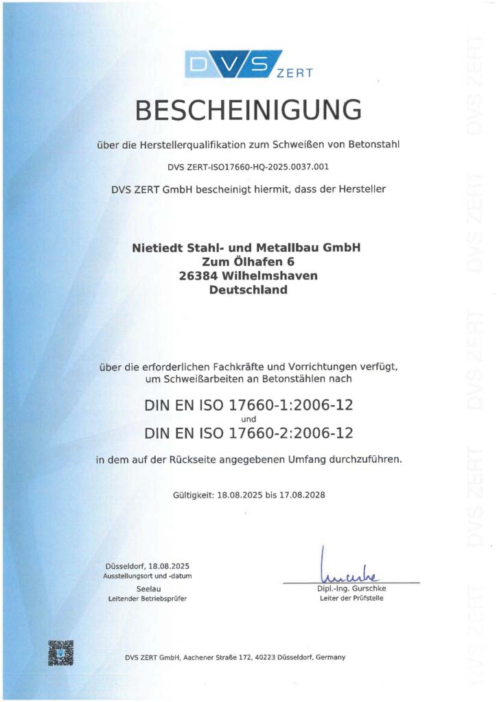 Unser Schwerpunkt im Stahlbau liegt in der Ver- und Bearbeitung von Baustählen bis einschließlich S355 gemäß der Ausführungsklasse 3 (EXC 3). Wir sind spezialisiert auf den Treppen- und Geländerbau, den Stahlhallenbau und die Metallfassadentechnik sowie den Sonderstahlbau. Außerdem hat sich das Nietiedt-Team durch die jahrzehntelange Erfahrung bei Stahlbau- und Schweißarbeiten sowie im Schiff-, Yacht- und Marinebau auch zum flexiblen Partner im Bereich des „Steel-Dressings“ vor und nach dem Schweißen entwickelt. Dieses umfasst Schleifarbeiten und das sogenannte „Rappeln“ zur Farb- und Rostentfernung, Kantenbrechungen, Schweißnahtkontrollen durch geschultes Personal und die Vorbereitungen zur Abnahme.